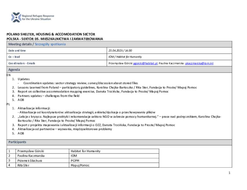 Poland: Shelter, Housing & Accommodation Sector Meeting Minutes (23 April 2025)