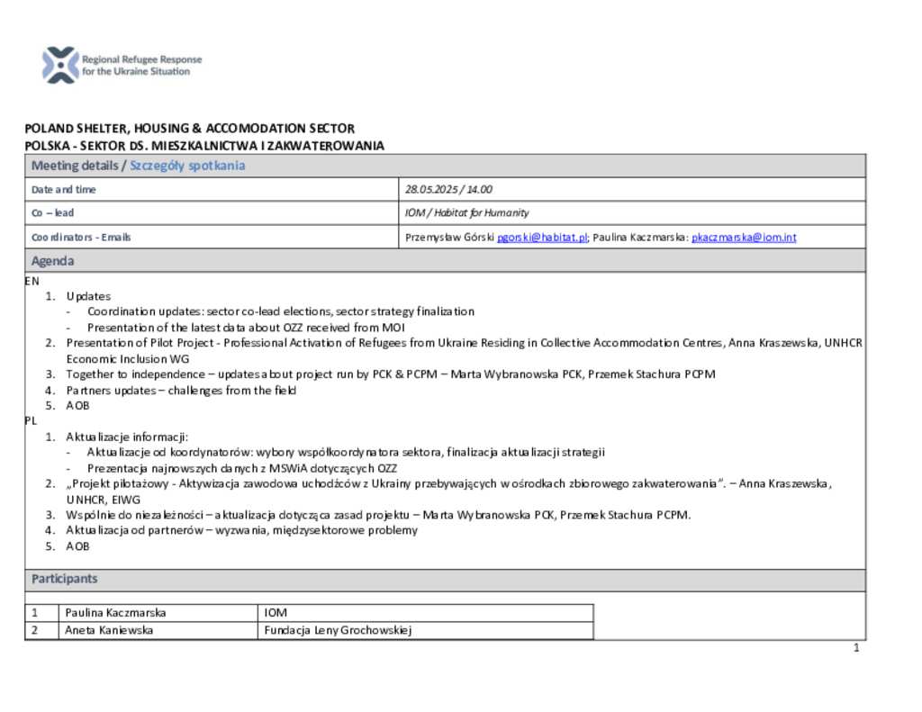 Poland: Shelter, Housing and Accommodation Sector Meeting Minutes (28 May 2025)