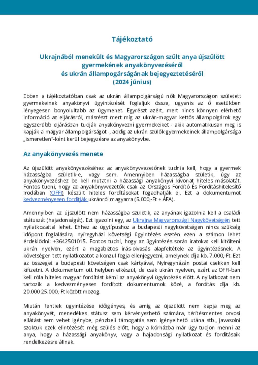 Hungary: Tájékoztató anyag az Ukrajnából menekült és Magyarországon szült anya újszülött gyermekének anyakönyvezéséről és ukrán állampogárságának bejegyeztetéséről (június 2024)