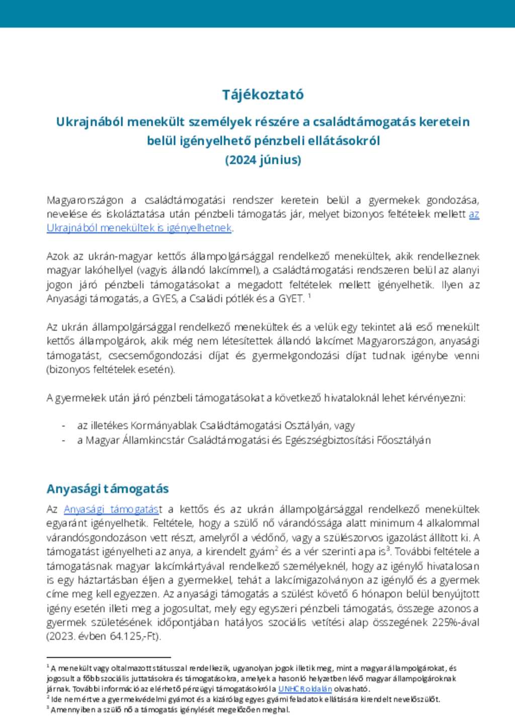 Hungary: Tájékoztató anyag az Ukrajnából menekült személyek részére a családtámogatás keretein belül igényelhető pénzbeli ellátásokról (június 2024)