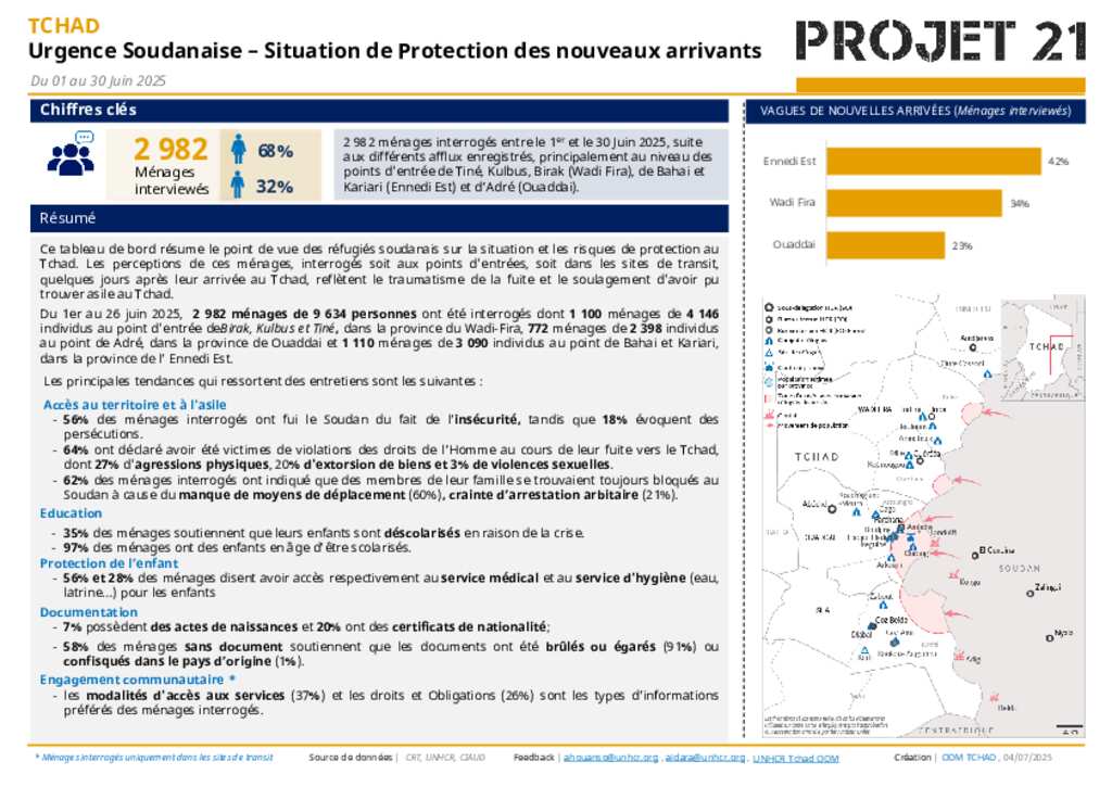 Ce tableau de bord résume le point de vue des réfugiés soudanais sur la situation et les risques de protection au Tchad. Les perceptions de ces ménages, interrogés soit aux points d'entrées, soit dans les sites de transit, quelques jours après leur arrivée au Tchad, reflètent le traumatisme de la fuite et le soulagement d'avoir pu trouver asile au Tchad. Du 1er au 26 juin 2025, 2 982 ménages de 9 634 personnes ont été interrogés dont 1 100 ménages de 4 146 individus au point d'entrée deBirak, Kulbus et Tiné, dans la province du Wadi-Fira, 772 ménages de 2 398 individus au point de Adré, dans la province de Ouaddai et 1 110 ménages de 3 090 individus au point de Bahai et Kariari, dans la province de l’ Ennedi Est.