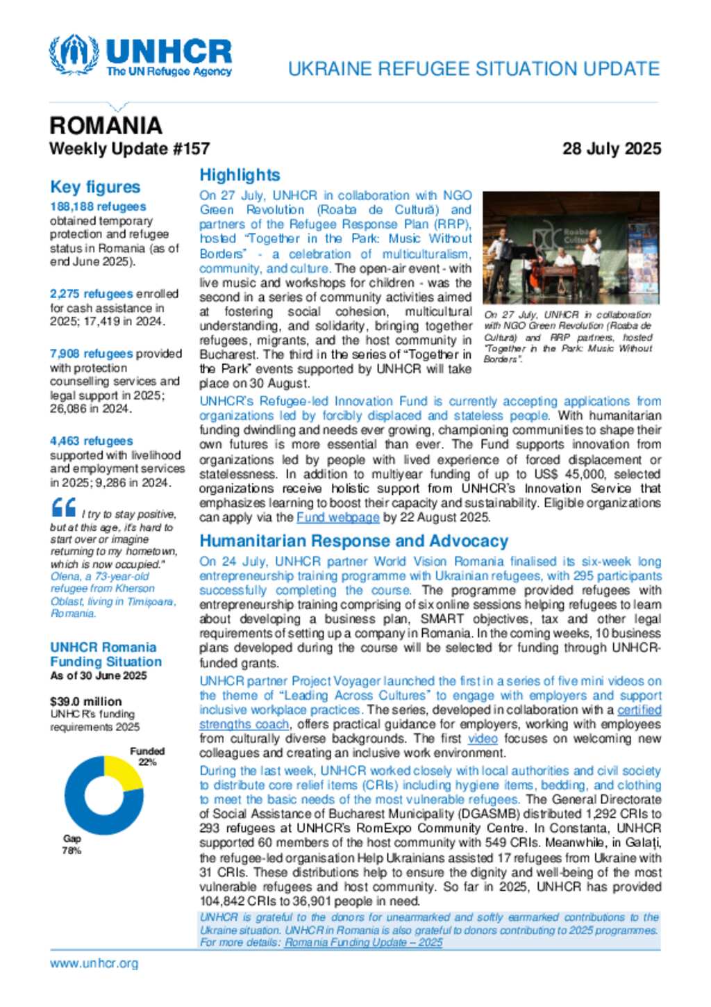 UNHCR Romania Ukraine Refugee Situation Update - 28 July 2025