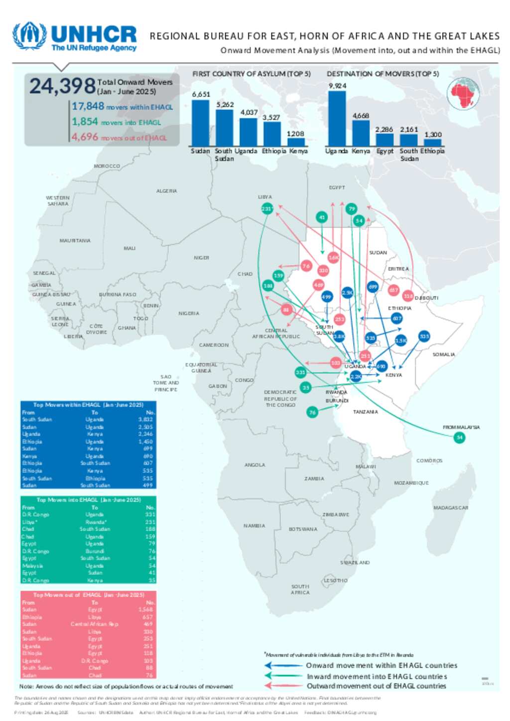 This map depicts the onward movement of registered refugees and asylum-seekers of EHAGL region whose biometrics have been captured in BIMS
