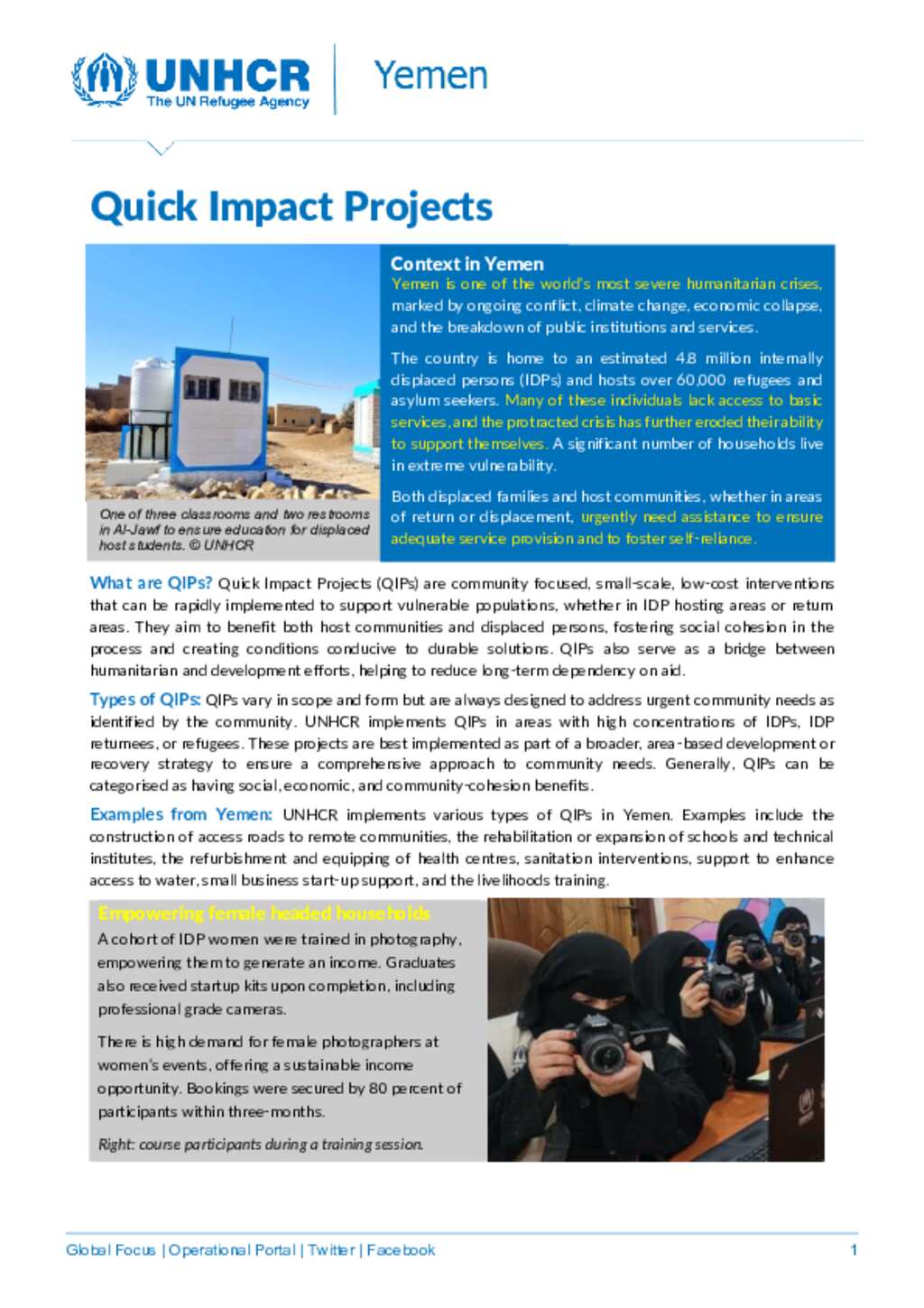 This factsheet highlights UNHCR Yemen’s Quick Impact Projects (QIPs) in 2025—small-scale, community-driven initiatives that promote social cohesion and self-reliance. In 2024, over 100 QIPs were implemented, including school rehabilitation, health center upgrades, flood mitigation, and vocational training. Notably, 90% of trained youth found employment, and 80% of female photographers secured bookings within three months.