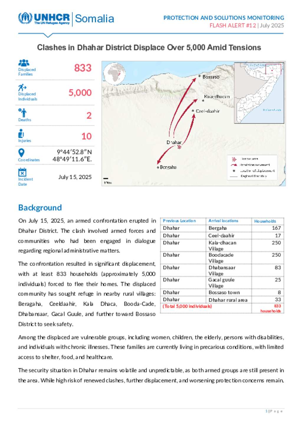 UNHCR Somalia Flash Alert #12- Clashes in Dhahar District Displace Over 5000 Amid Tensions