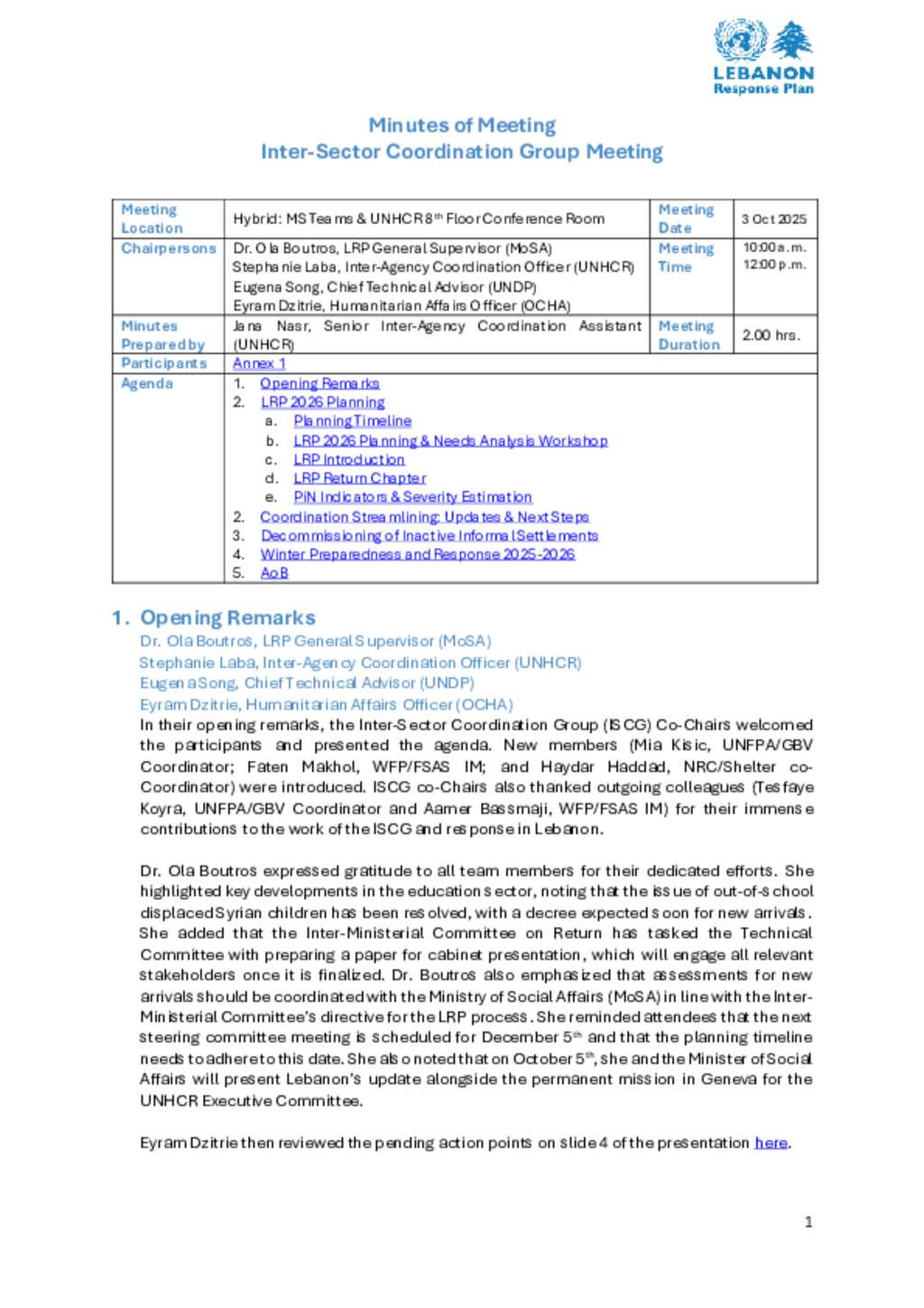 Lebanon: Inter-Sector Coordination Group Minutes of Meeting - 3 October 2025