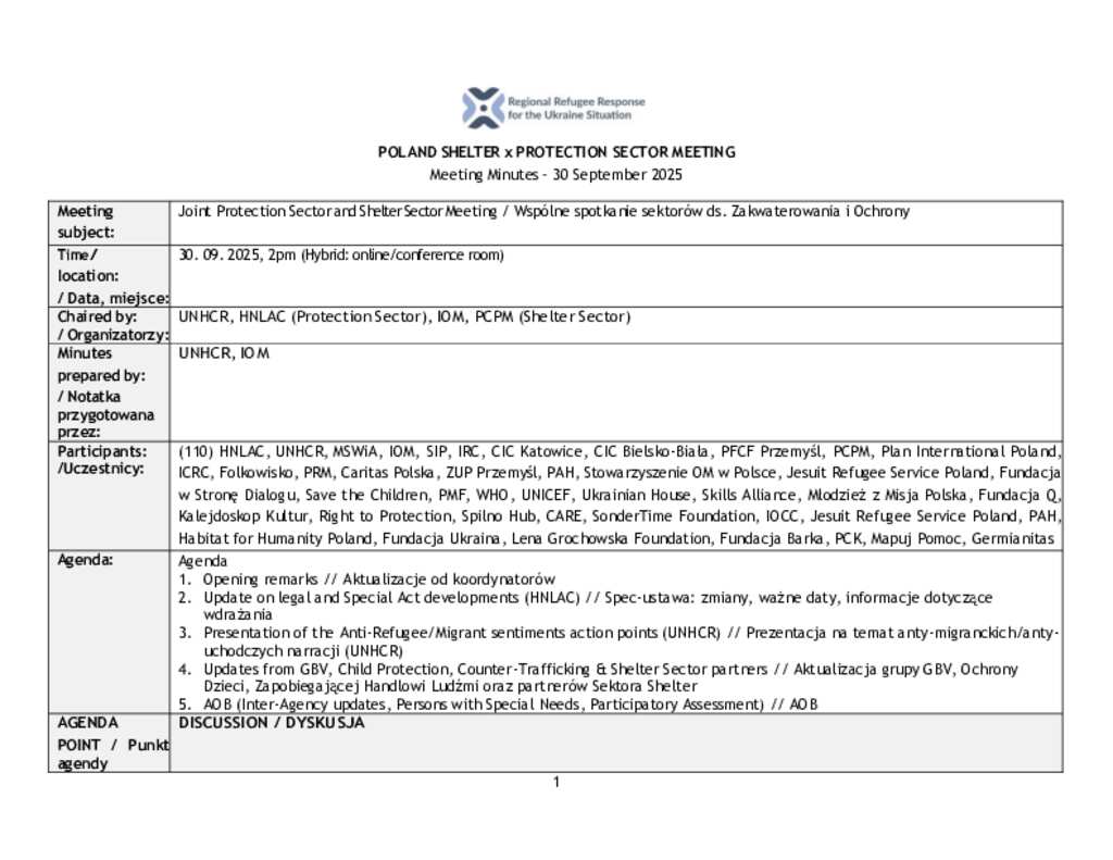 Poland: Joint Shelter & Protection Sector meeting - minutes notes (30 September 2025)