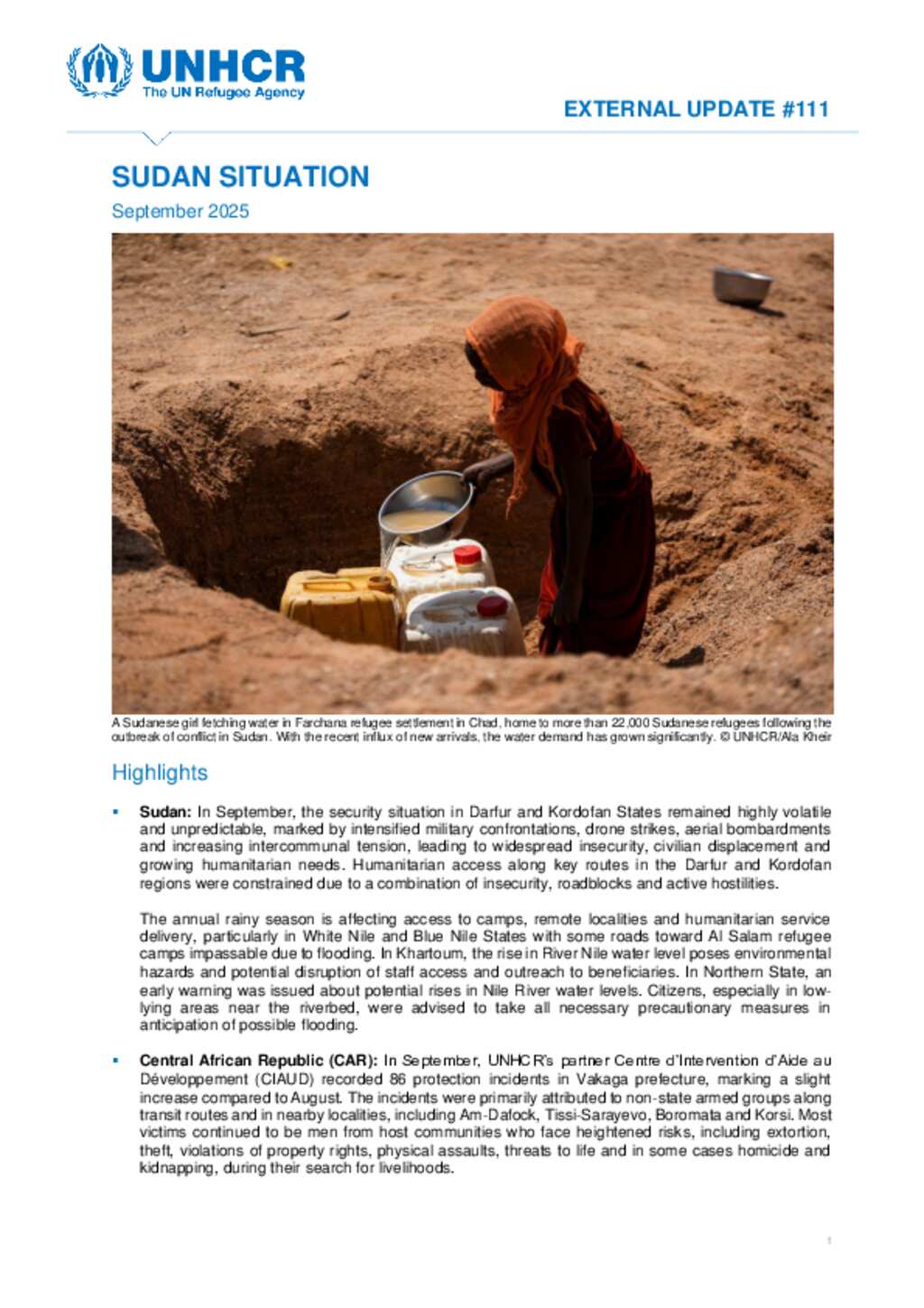 Sudan Situation: UNHCR Monthly External Update #111 - September 2025