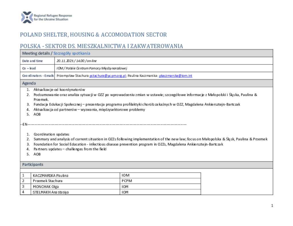 Poland: Shelter, Housing and Accommodation Sector Meeting Minutes (20 November 2025)