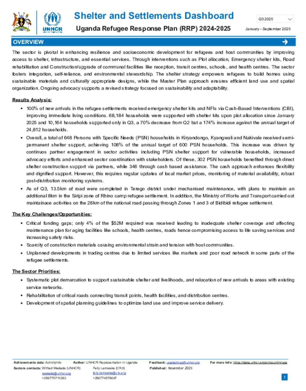 Uganda Refugee Response: Shelter, Settlement and NFI dashboard Quarter 3 2025