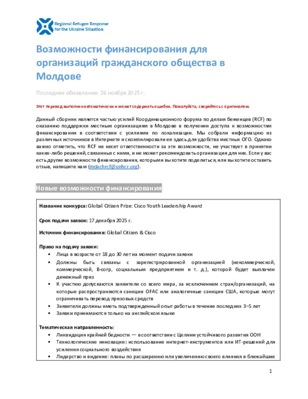 Ukraine Situation - Moldova: Funding Opportunities for Local CSOs in Moldova (November 2025) (RU)