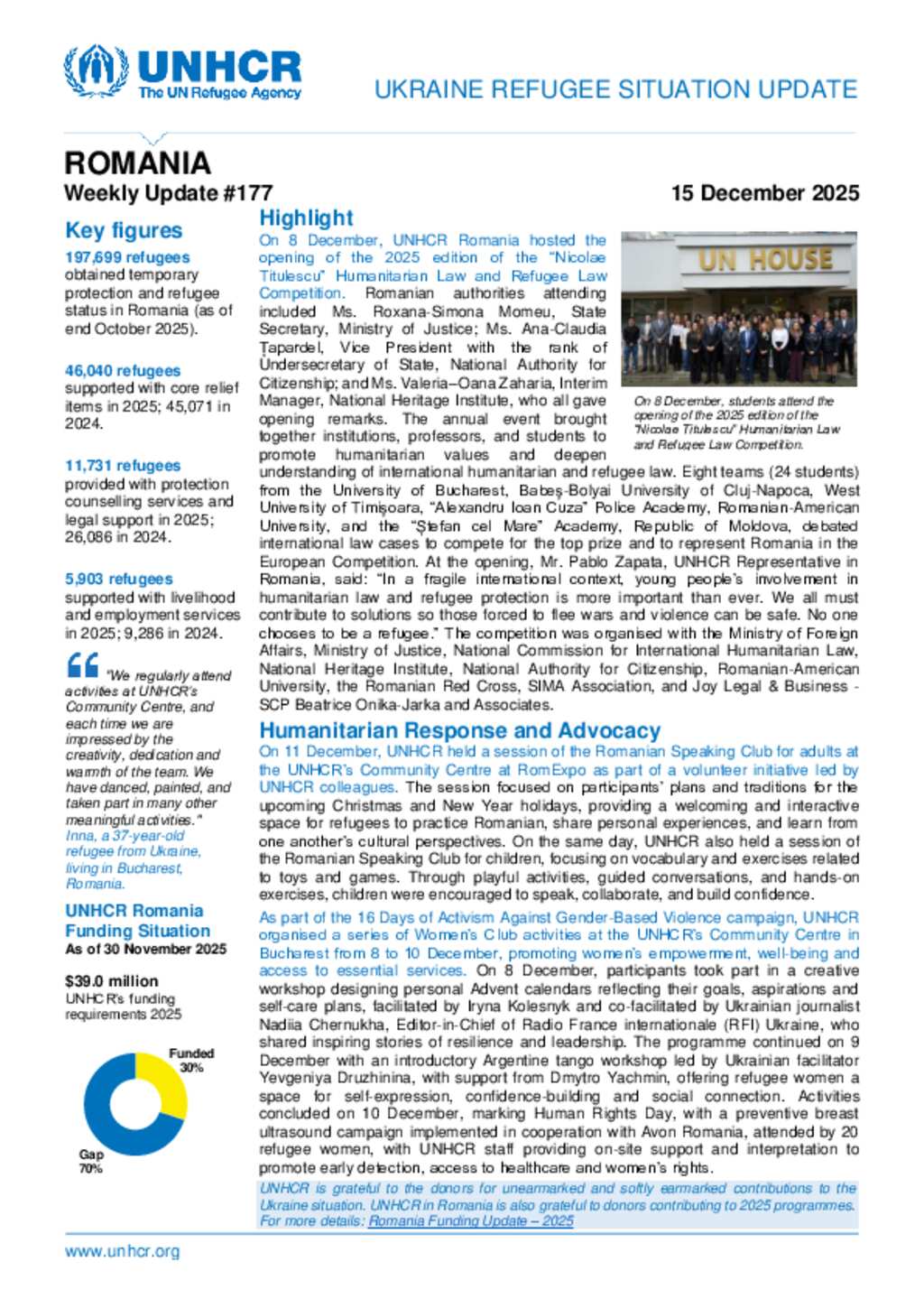 UNHCR Romania Ukraine Refugee Situation Update - 15 December 2025