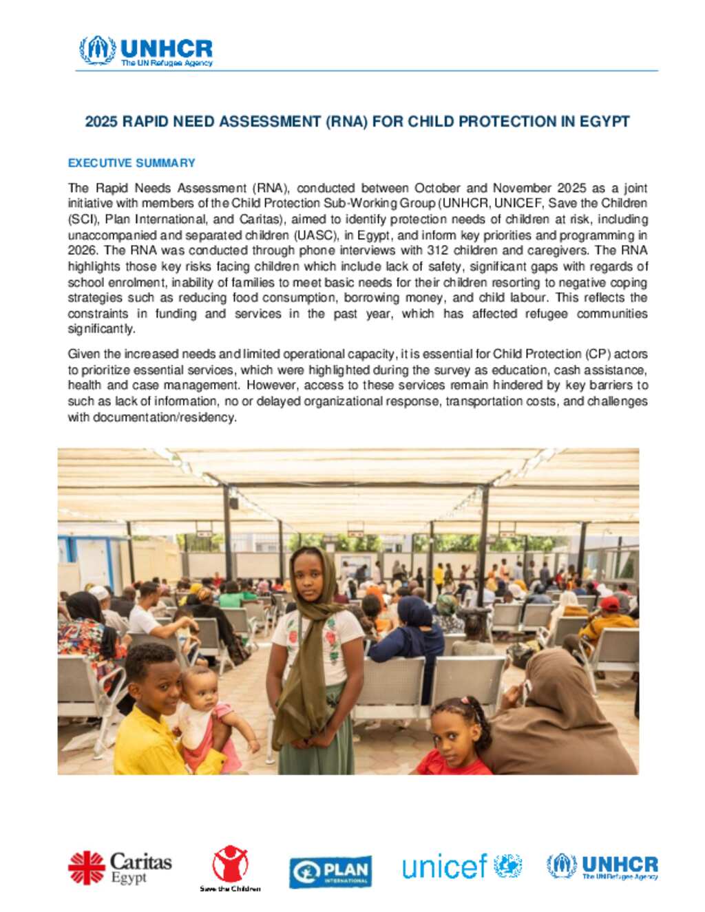 The Rapid Needs Assessment (RNA), conducted between October and November 2025 as a joint initiative with members of the Child Protection Sub-Working Group (UNHCR, UNICEF, Save the Children (SCI), Plan International, and Caritas), aimed to identify protection needs of children at risk, including unaccompanied and separated children (UASC), in Egypt, and inform key priorities and programming in 2026. The RNA was conducted through phone interviews with 312 children and caregivers. The RNA highlights those key risks facing children which include lack of safety, significant gaps with regards of school enrolment, inability of families to meet basic needs for their children resorting to negative coping strategies such as reducing food consumption, borrowing money, and child labour. This reflects the constraints in funding and services in the past year, which has affected refugee communities significantly.