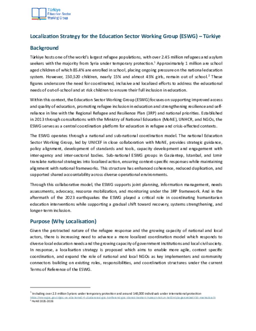 Türkiye: Education Sector WG - Localisation Plan/ Strategy for the Education Sector Working Group (ESWG) – January 2026