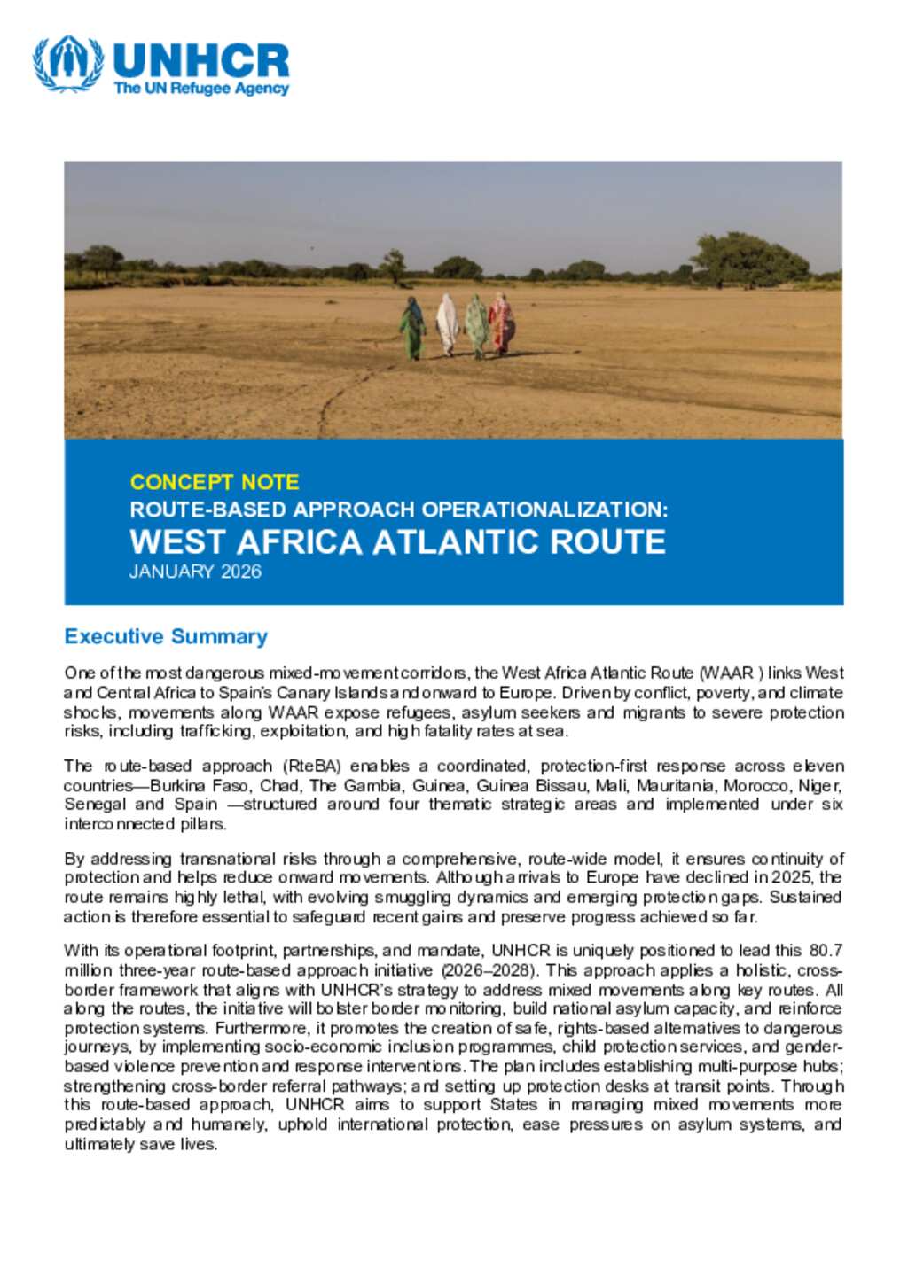 This concept note presents UNHCR’s proposed route-based approach for the West Africa and Atlantic Route (2026–2028), detailing a coordinated, multi-country response to mixed movements. It sets out strategic priorities and interventions aimed at reducing harm, strengthening protection and asylum systems, and expanding sustainable solutions for refugees and migrants along the route.
