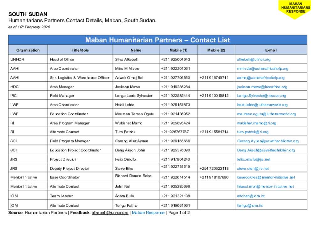 South Sudan - Maban Humanitarians Partners Contact Details - February 2026