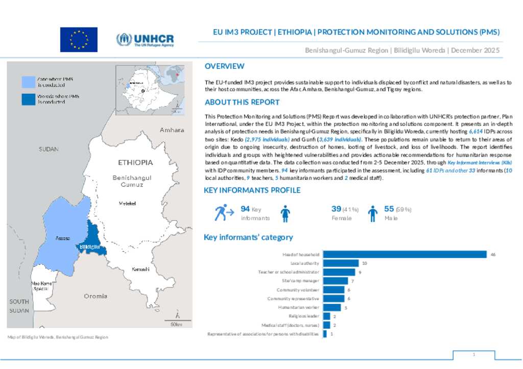 This Protection Monitoring and Solutions (PMS) Report was developed in collaboration with UNHCR’s protection partner, Plan International, under the EU IM3 Project, within the protection monitoring and solutions component. It presents an in-depth analysis of protection needs in Benishangul-Gumuz Region, specifically in Biligildu Woreda, currently hosting 6,614 IDPs across two sites: Kedo (2,975 individuals) and Gunfi (3,639 individuals). These populations remain unable to return to their areas of origin due to ongoing insecurity, destruction of homes, looting of livestock, and loss of livelihoods. The report identifies individuals and groups with heightened vulnerabilities and provides actionable recommendations for humanitarian response based on quantitative data. The data collection was conducted from 2-5 December 2025, through Key Informant Interviews (KIIs) with IDP community members. 94 key informants participated in the assessment, including 61 IDPs and other 33 informants (10 local authorities, 9 teache