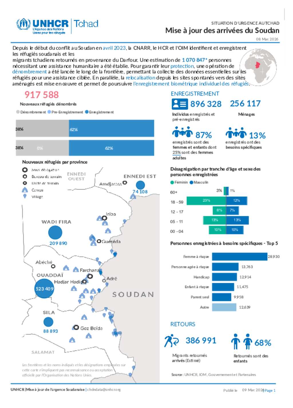 UNHCR TCHAD| Afflux des Réfugiés du Soudan | Statistiques de l'enregistrement individuel biométrique (au 08 mars 2026)