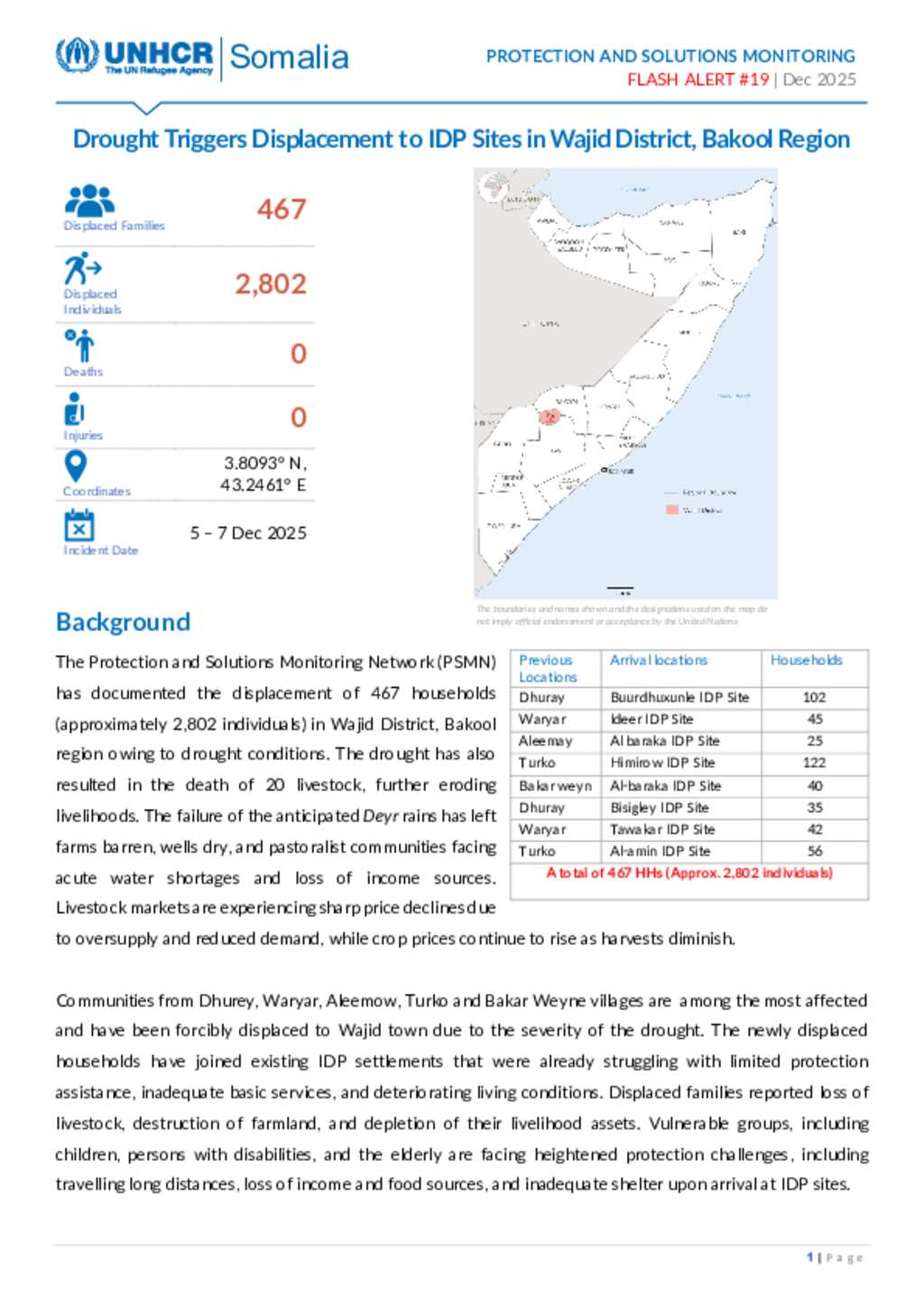 The Protection and Solutions Monitoring Network (PSMN) has documented the displacement of 467 households (approximately 2,802 individuals) in Wajid District, Bakool region owing to drought conditions.