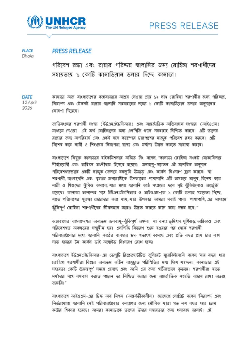 Canada has announced a CAD 10 million contribution to support clean and sustainable cooking for nearly 1.2 million Rohingya refugees in Cox’s Bazar, reinforcing efforts to protect both people and the environment. The funding, delivered through UNHCR and IOM, will expand access to liquefied petroleum gas, helping reduce deforestation, improve safety, and uphold dignity for refugee families, especially women and children.