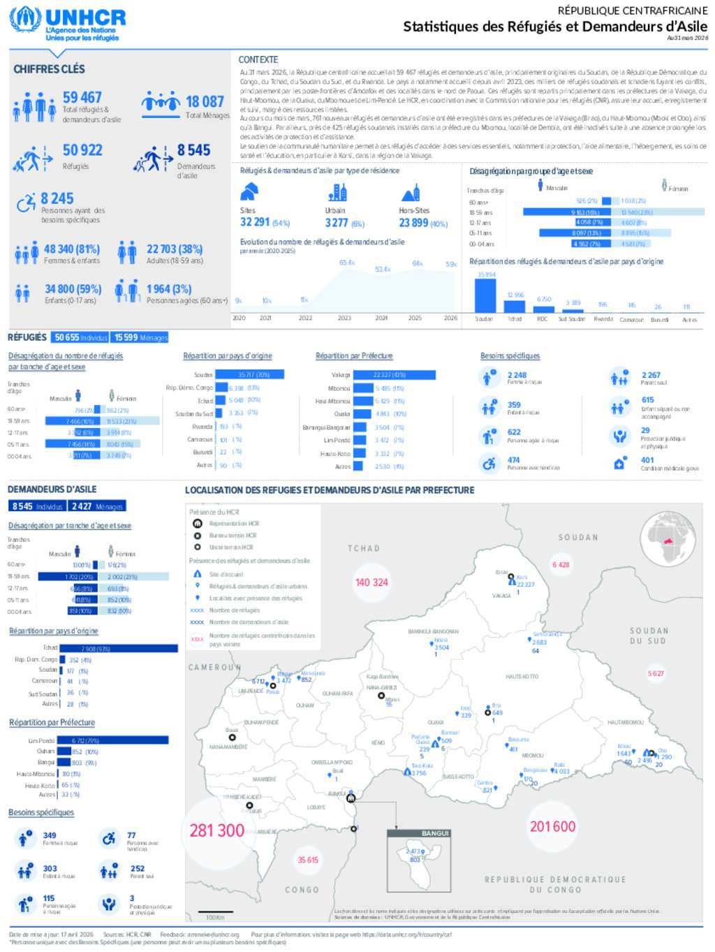 RCA Statistiques des réfugiés et demandeurs d'asile - 31 Mars 2026