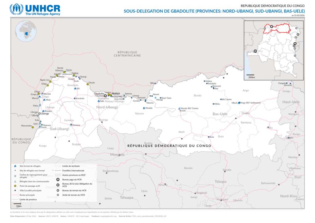 République Démocratique du Congo - Carte opérationnelle, sous-délégation de Gbadolite au 31 mars 2026
