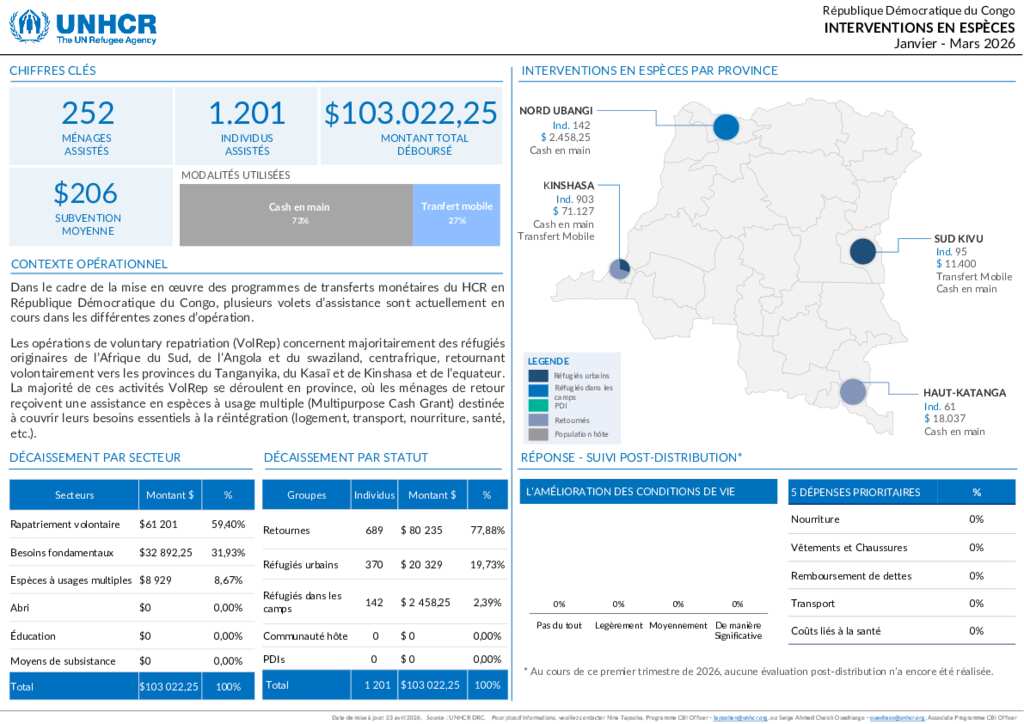 République Démocratique du Congo - Interventions basées sur les espèces au 31 mars 2026