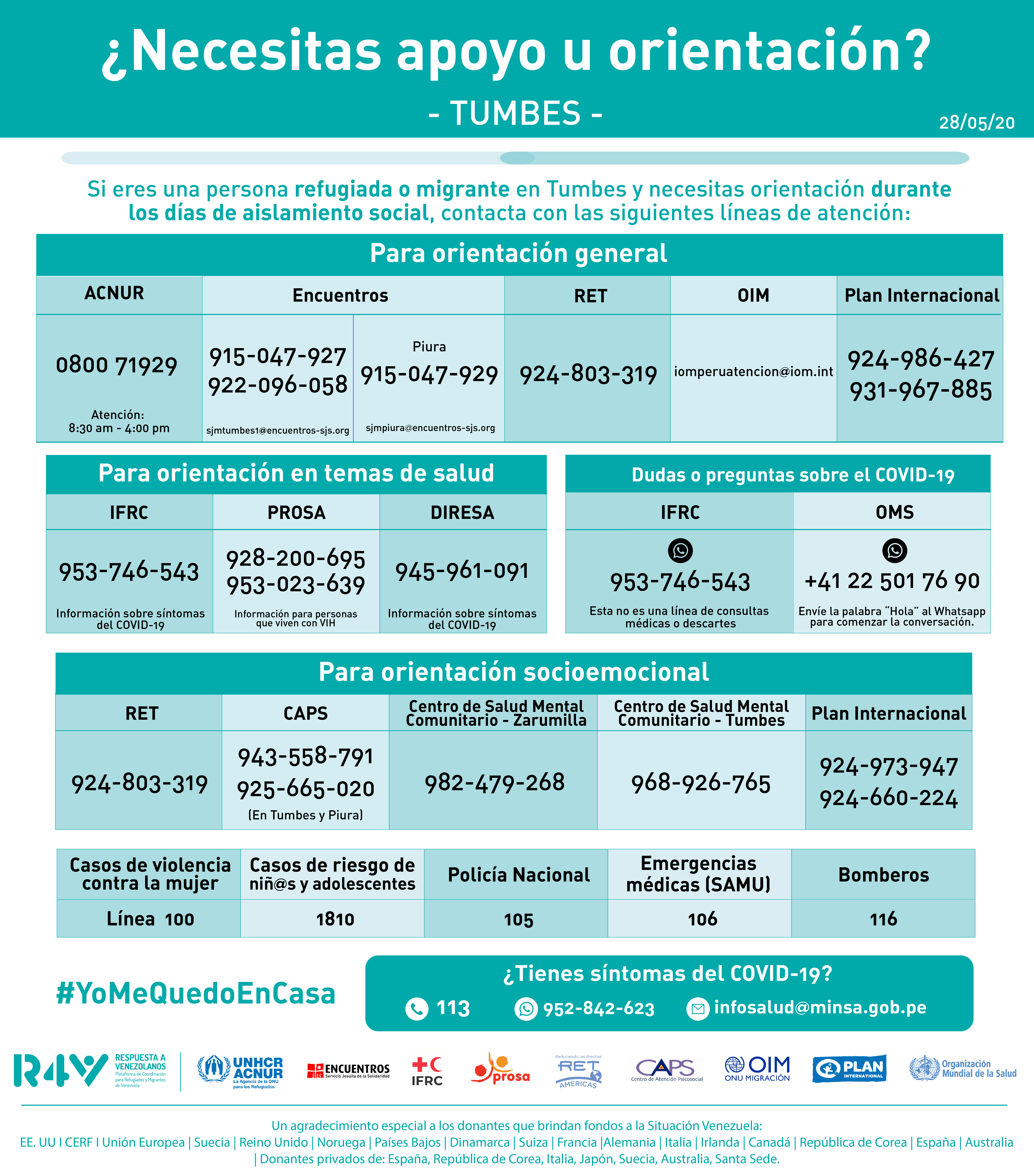 Contacto de organizaciones que brindan asistencia específica a la población refugiada y migrante venezolana durante la cuarentena en Tumbes.