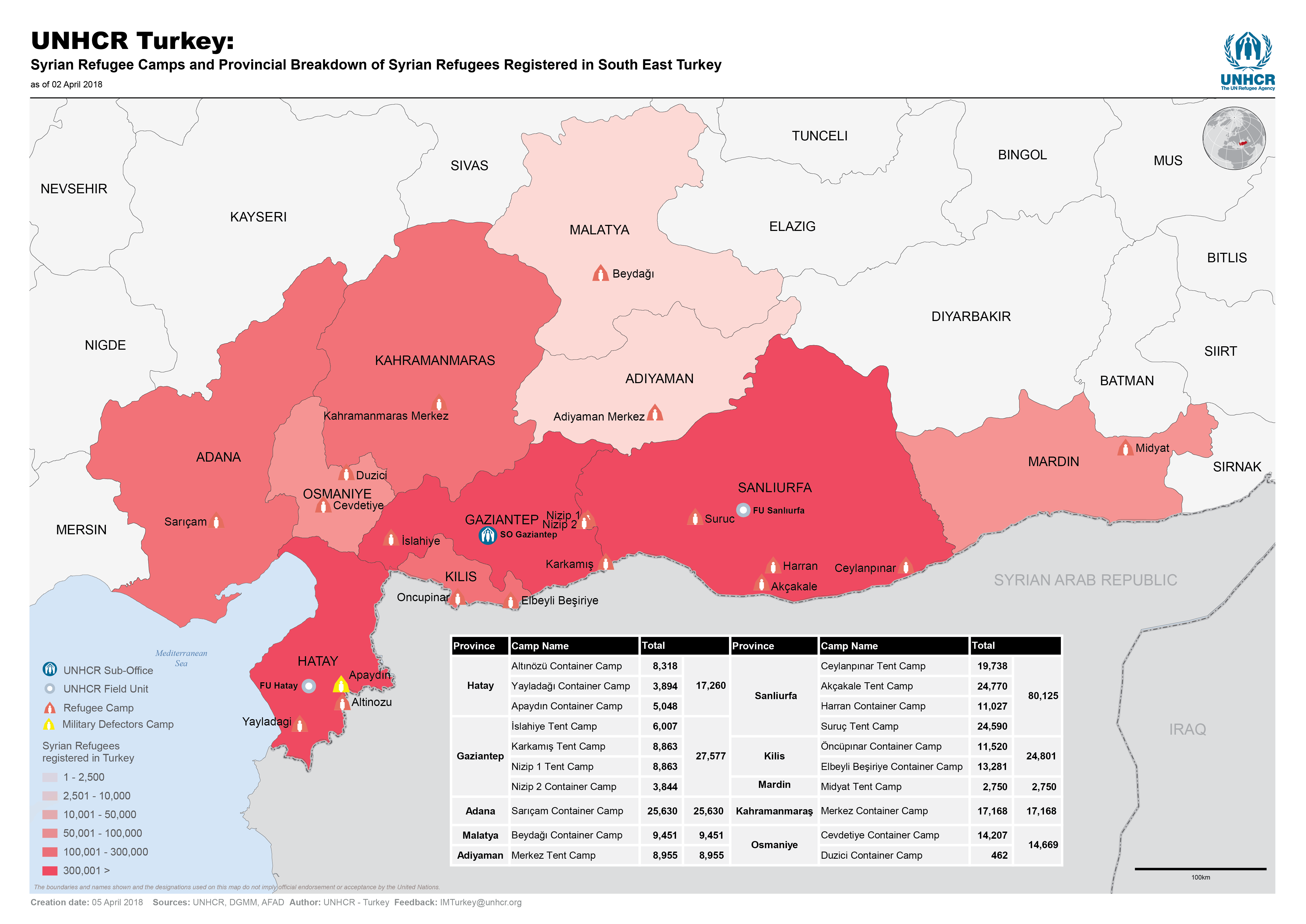 UNHCR Turkey - Syrian Refugee Camps and Provincial Breakdown of Syrian Refugees Registered in South East Turkey- April 2018